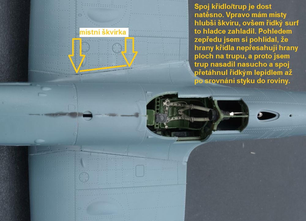 Na spodní motorový dekl jsem při lepení musel dost tlačit a malinko mi ujížděl dopředu. Příčinou bylo, že při snaze dostat spoj křídlo/trup do roviny jsem vepředu křídlo nedomáčknul do trupu úplně, protože by se mi mezi do trupu vlepovanými přechody a křídlem vytvořil schod. Důležité ale je, že spodní dekl v trupu na šířku sedí, jen pilkou trochu protáhnu boční spoj.