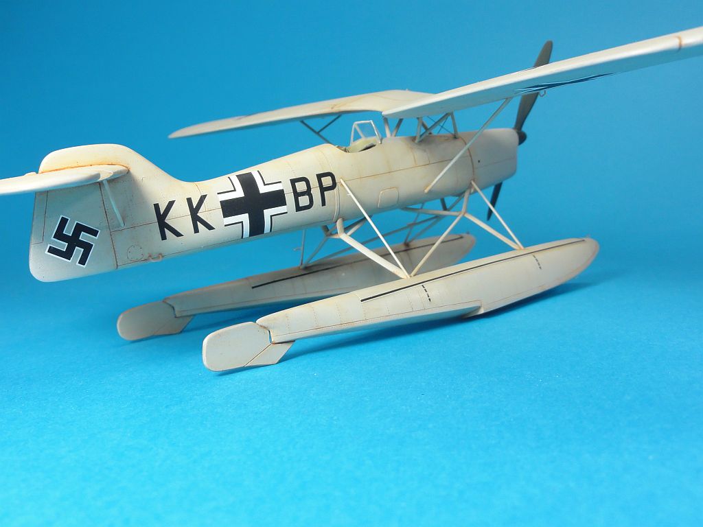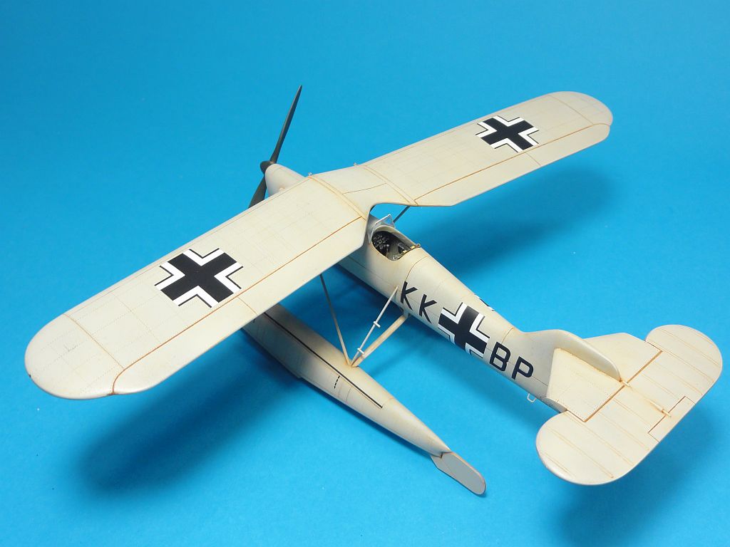 Model mi dlouho ležel ve skříni, ale jeho neokoukaná konstrukce byla hlavním důvodem pro stavbu. Jak je vidět na fotkách, tak začišťování všech dílů bylo docela dost. Uretany jsem použil skoro všechny, i z toho motoru je něco vidět. Kokpitu uretany svědčí, jen se mi nezdála sedačka, která přesahuje obrys trupu, ale nechal jsem to být. Doplnil jsem jen vázací oka na špičkách plováků a náběžných hranách. Celý model jsem lehce onýtoval podle svého vlastního výkresu.